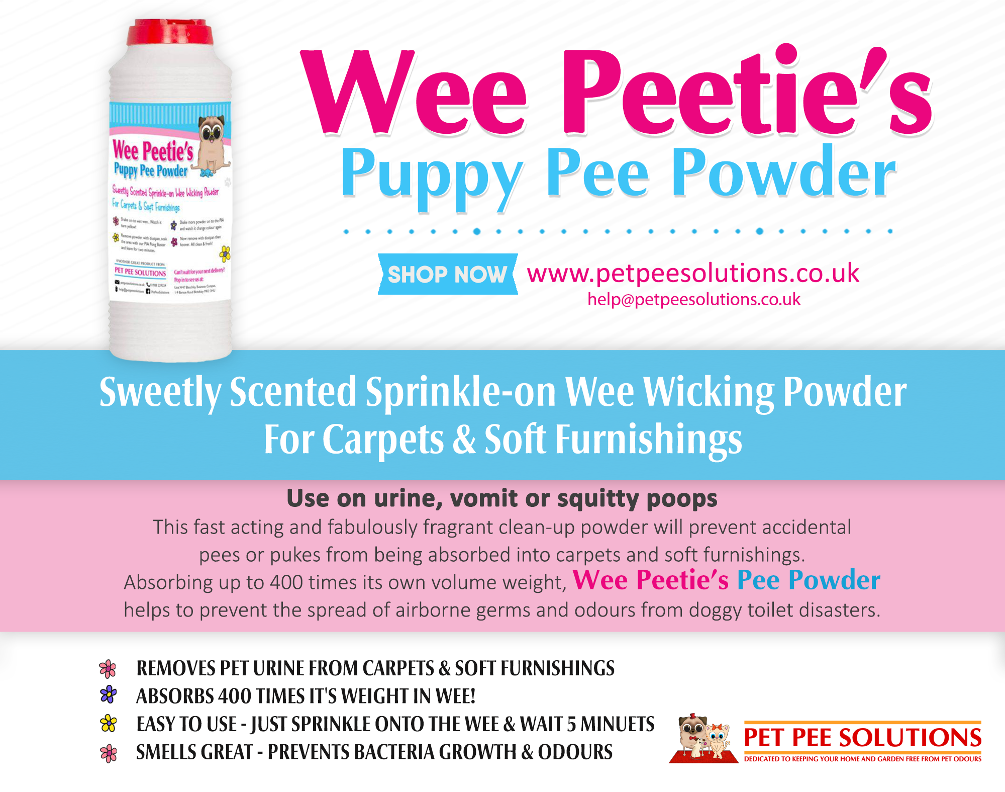 Sweetly Scented Sprinkle-on Wee Wicking Powder – Absorbs pet pee from carpets & soft furnishings